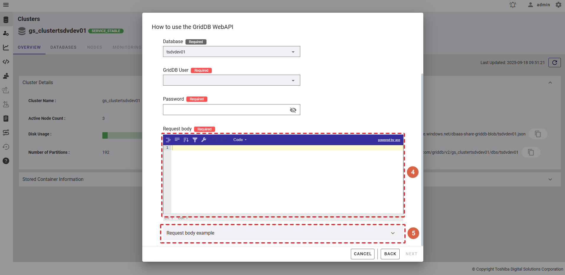 GridDB WebAPIのURLをクリップボードにコピーするには、 [Copy GridDB WebAPI URL] ボタン (①) をクリックします。