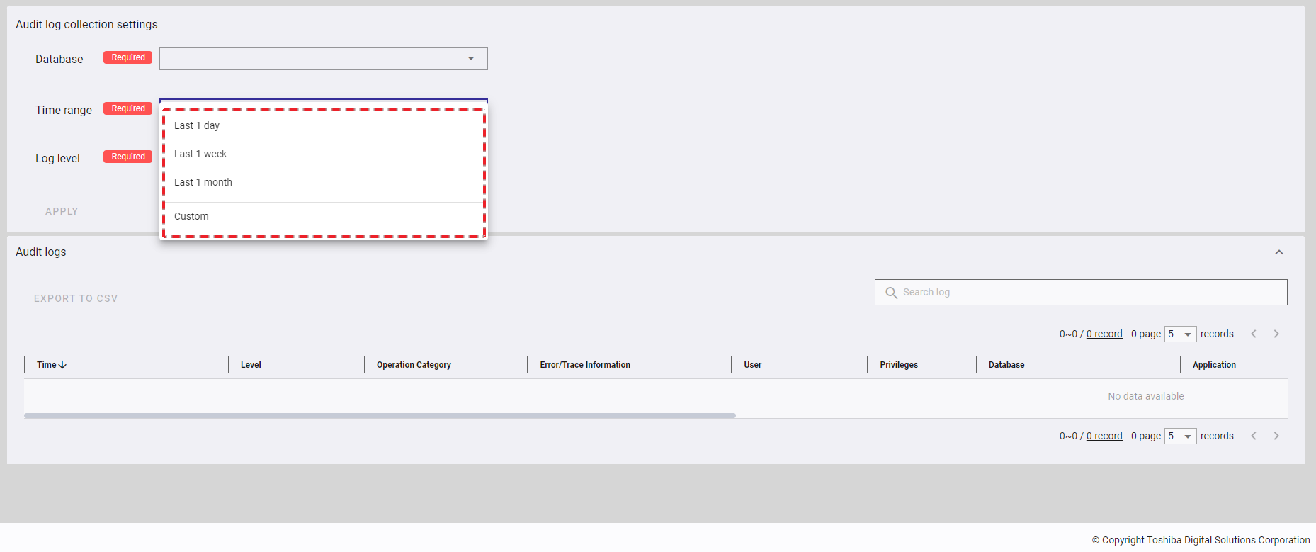 | 13 | Audit log | すべてのデータベース監査ログを表示します。 | - | + |