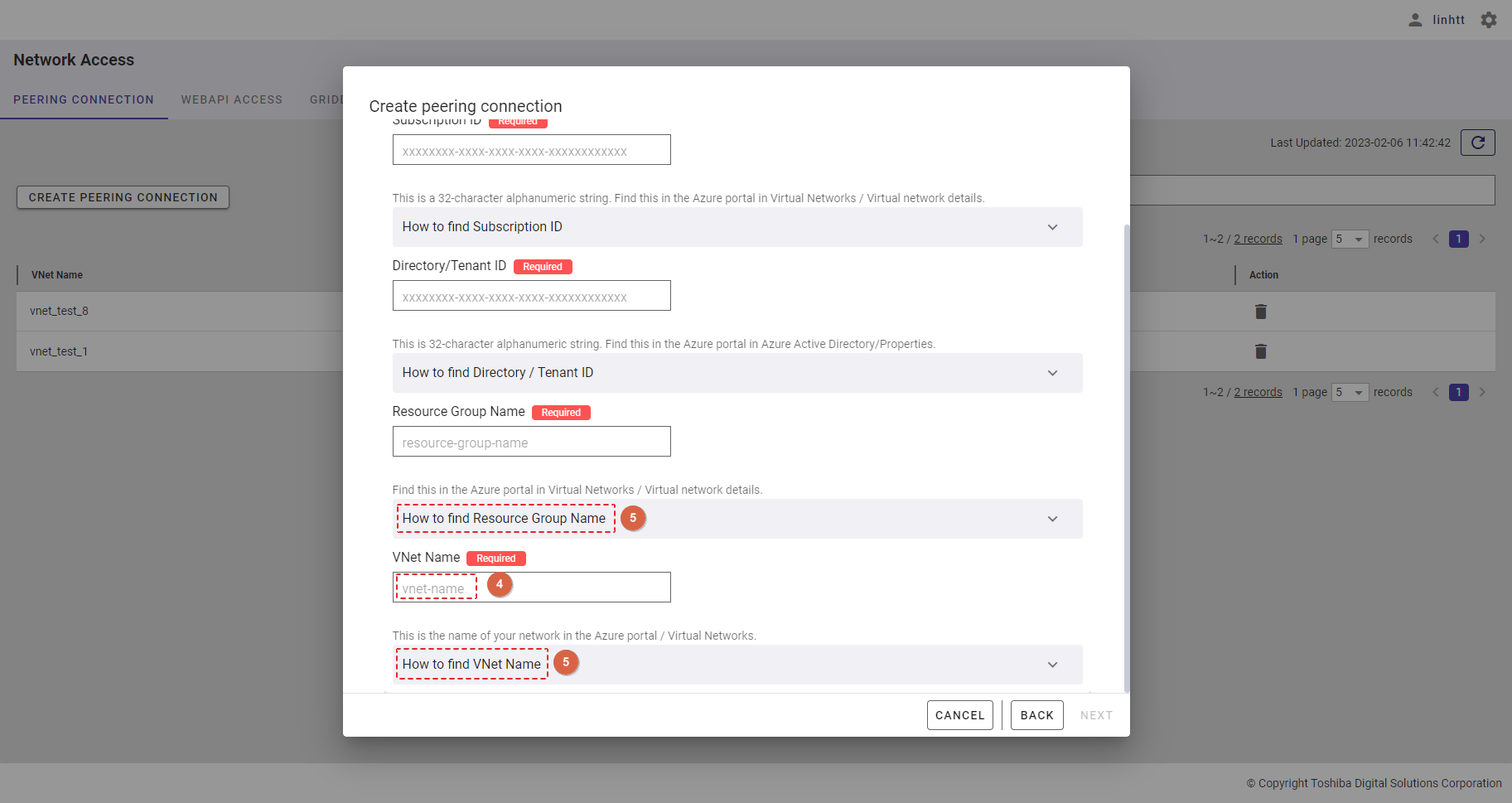 VNet設定を入力後、[NEXT] ボタン(②) をクリックし、ステップ4("アクセス付与"フェーズ)に進みます。クラウドプロバイダを変更する場合は、[BACK] ボタン(①)をクリックし、ステップ2("クラウドプロバイダ"フェーズ)に戻ります。ピアリング接続を作成せずにダイアログを閉じるには、[CANCEL] ボタンをクリックします。