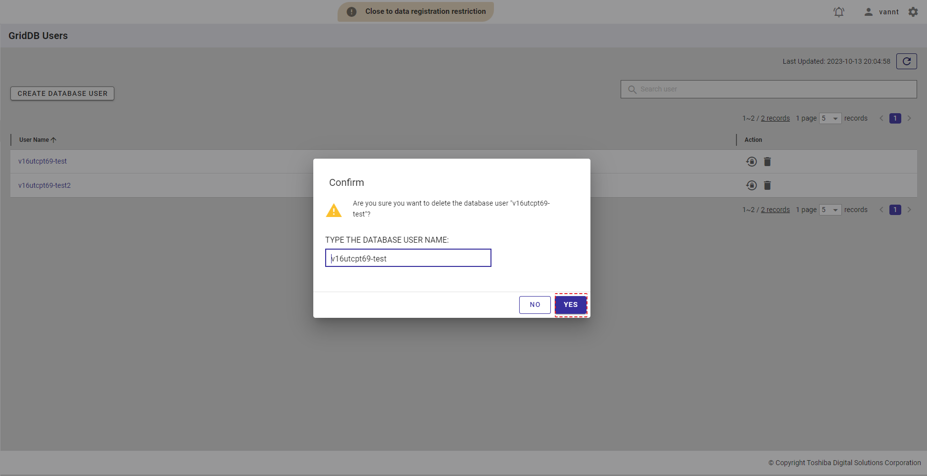ステップ1: [Action] カラムにある [DELETE] ボタンをクリックすると、確認ダイアログが表示されます。